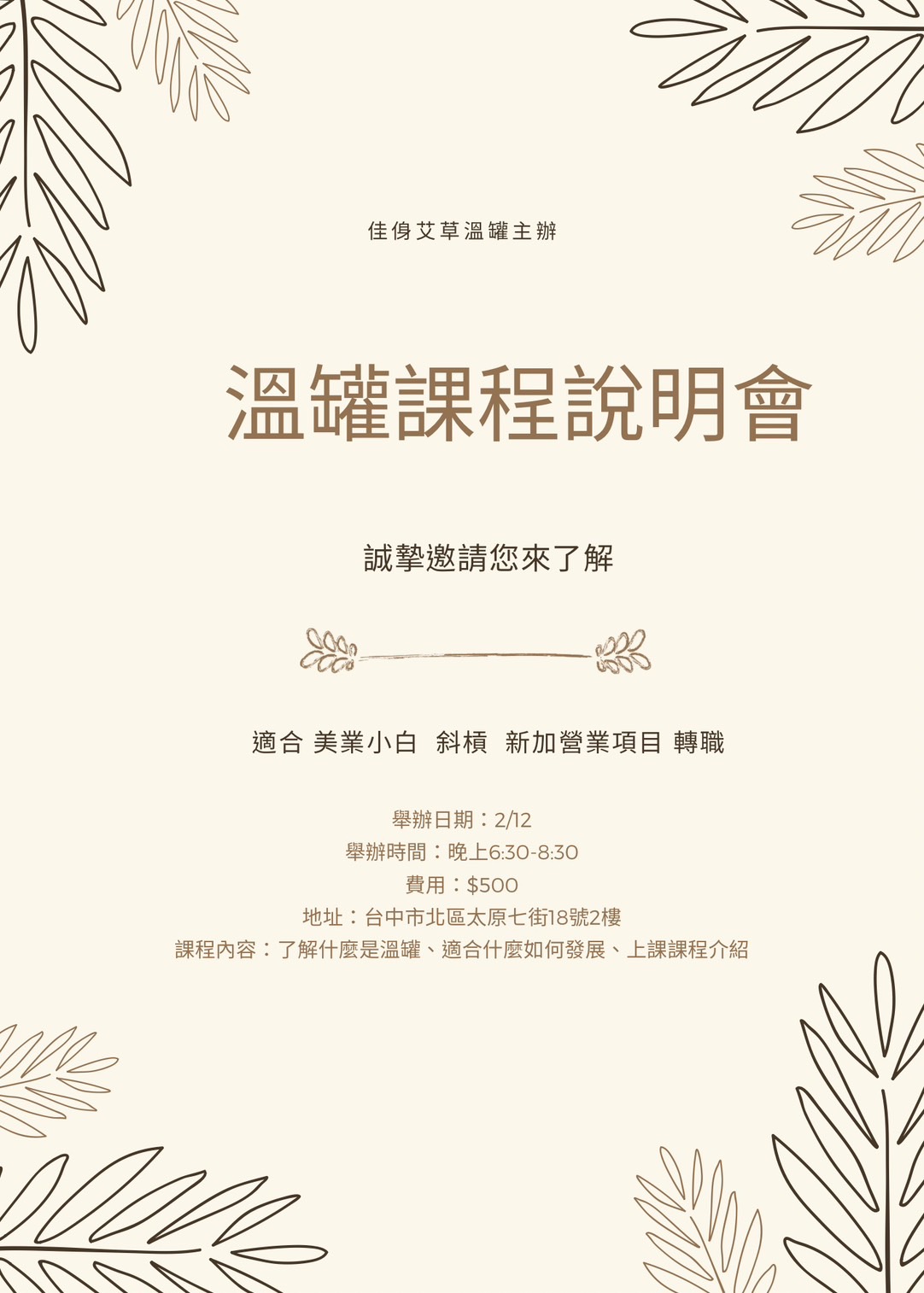 上次我們的溫罐課程說明會反應非常不錯,大家的回饋也讓我們很有信心!因此,我們即將在 2月正式開課,希望能幫助更多人了解溫罐,並將它應用到自己的專業或轉職需求中。