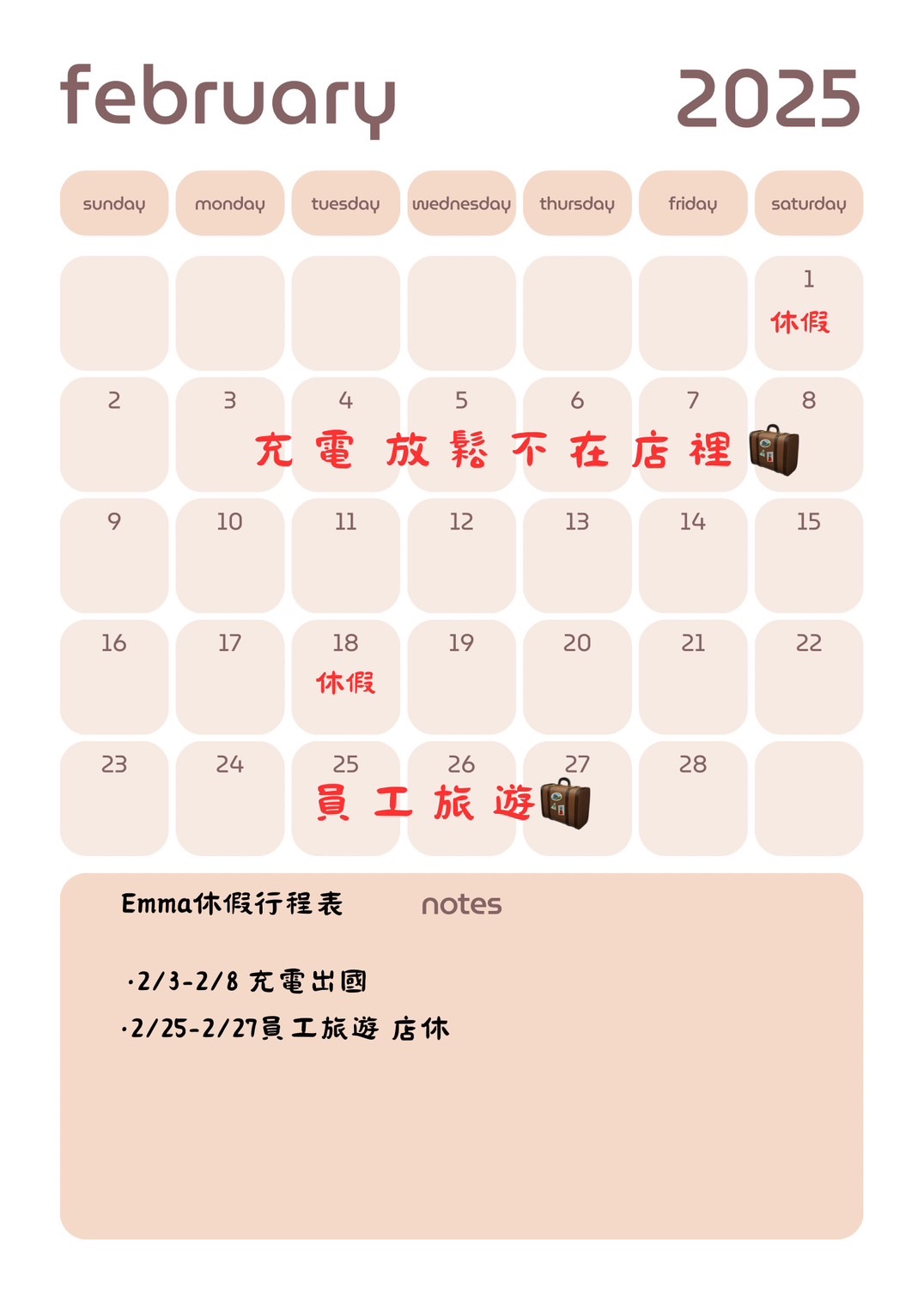 •Emma休假:2/3-2/8 Emma將充電出國,暫時不在店裡哦~
