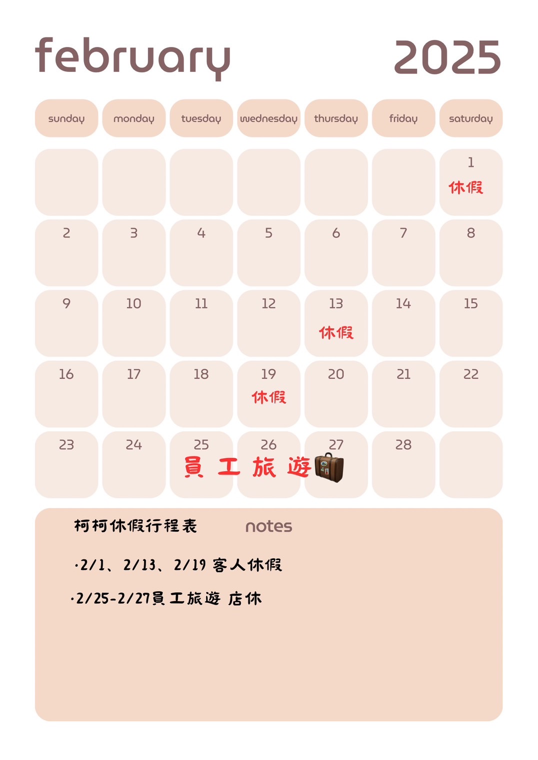 •員工旅遊:2/25-2/27 員工出遊,兩間店都會暫時休息,請大家提前安排時間哦!