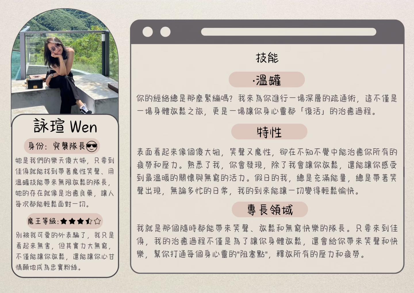 幽默毒舌BUFF:就算痛到快升天,她也能用一句話讓你笑到忘記疼痛。你以為你來這裡是放鬆的?不,你是來被「笑」癱的!
